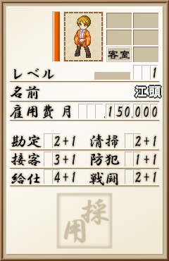 | 名前 | 初期Lv | 雇用費用 | 勘定 | 接客 | 給仕 | 掃除 | 防犯 | 戦闘 | 保有スキル |